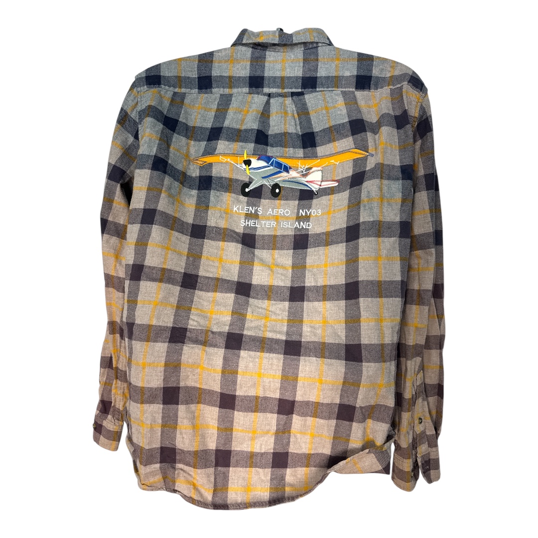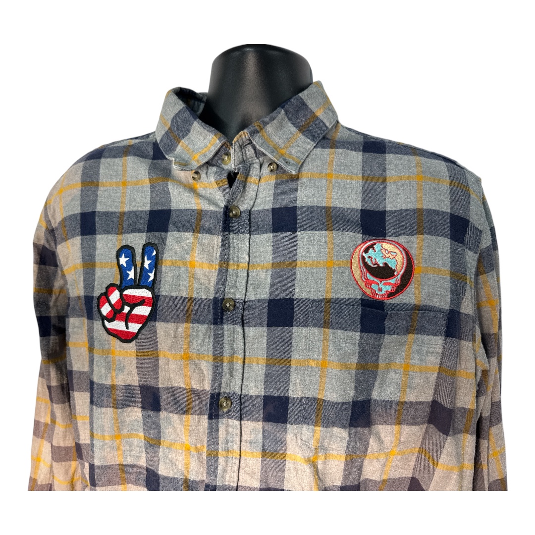 Extra Large vintage flannel shirt with embroidery. Custom embellished and is one of a kind. Peace sign and Rock Head on front. Klen’s Areo with an applique high wing on back. Shirt is treated in a pre-wash.